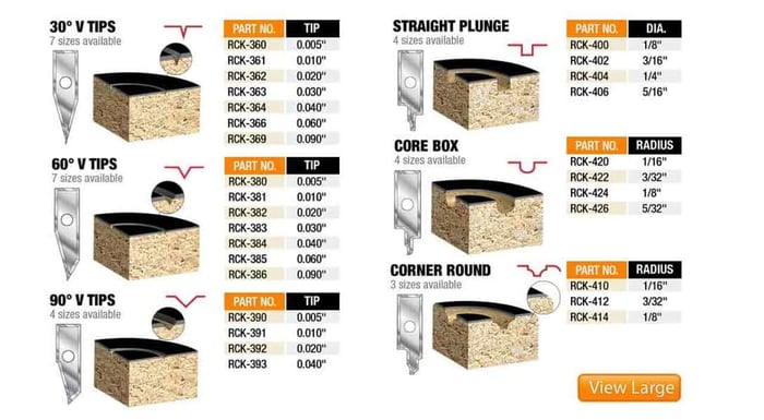 Las brocas de grabado de carburo sólido Amana Tool con punta en V e inserto In-Groove son ampliamente utilizadas por rotulistas profesionales. Permiten letras nítidas en madera, HDU, plásticos e incluso aluminio, con una vida útil más larga que las brocas para aficionados.