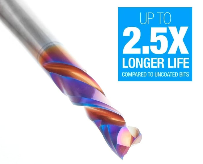 Consejo: Cuando se cortan materiales que generan calor o polvo fino -acrílico, HDU, laminados de madera contrachapada- la diferencia en el desgaste de los bordes entre las brocas recubiertas y las no recubiertas se vuelve dramática después de sólo unas pocas pasadas.